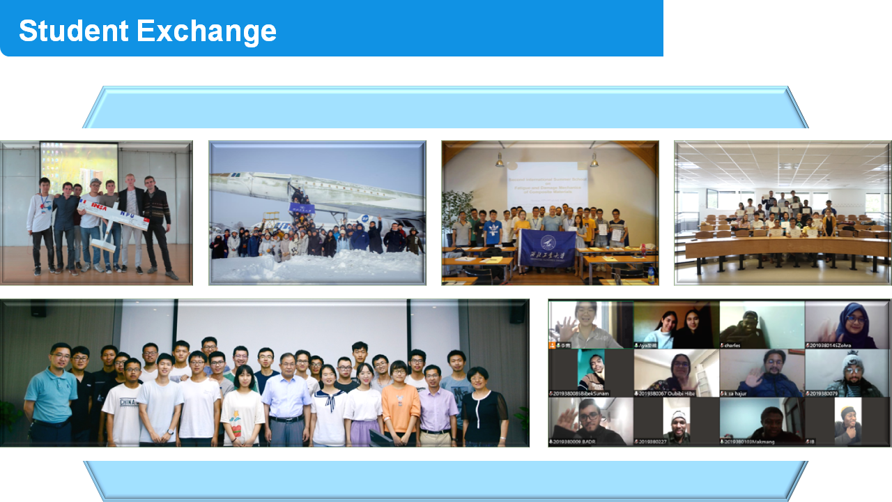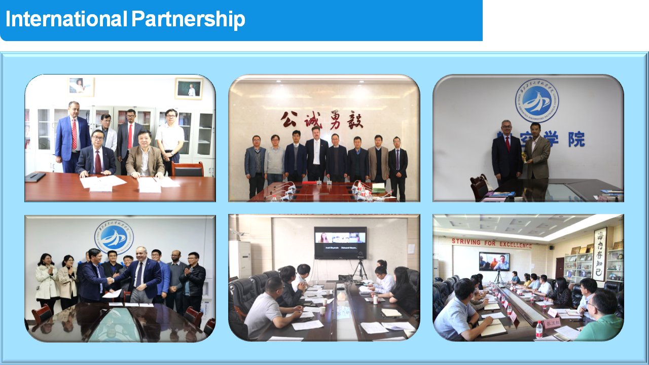 School of Aeronautics upholds international collaboration in various ways such as students exchange, scholar exchange, collaborative research, international conference, and etc. During the 13th five-year plan period, School of Aeronautics enrolled 190 international students for degree programs, 25 students for 3-24 month visits, and 108 students for short visits; the School sent 106 students overseas for 3-24 month visits and 493 students overseas for international conferences, inter-university exchange programs, and summer/winter schools. The School signed cooperation agreements with seven universities and institutions and has partnership with over 40 well-known universities all over the world. There are two national-level Overseas Expertise Introduction Centers for Discipline Innovation (111 centers), one national-level Joint International Research Lab and three joint research labs in our school. Based on these international platforms, joint research and academic exchange have been widely carried out. During the 13th five-year plan period, our school held 14 international conferences and received visits of about 80 outstanding overseas scholars on average per year from well-known universities of U.S, U.K, France, Germany, Japan, Singapore, etc, and about 100 school staffs per year went overseas for academic exchange and collaboration.