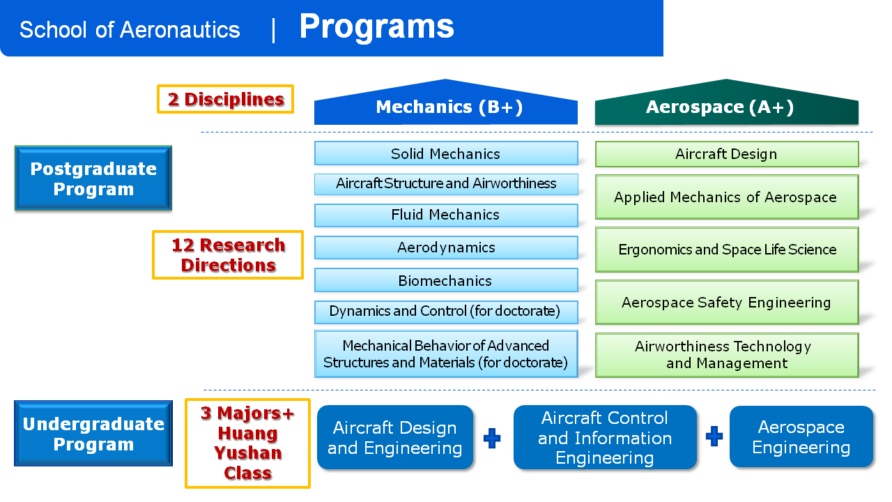 School of Aeronautics takes educating students as the most essential duty, exalting the spirit of shaping values, developing capabilities and imparting knowledge and making full efforts to train leading talents who strive for excellence with passionate commitment to aeronautics. School of Aeronautics offers 2 disciplines (Aerospace Science and Technology; Mechanics) comprised of 12 research directions for postgraduates, and 3 majors and one innovative and reforming program that is Huang YuShan Class for undergraduates, as shown in Table 1. It offers four English majors for international students, as shown in Table 2. Aerospace Science and Technology discipline is ranked top 2 in Shanghai Global Ranking of Academic Subjects 2020 and rated as A+ in the fourth discipline evaluation of conducted by the Ministry of Education of P.R. China.