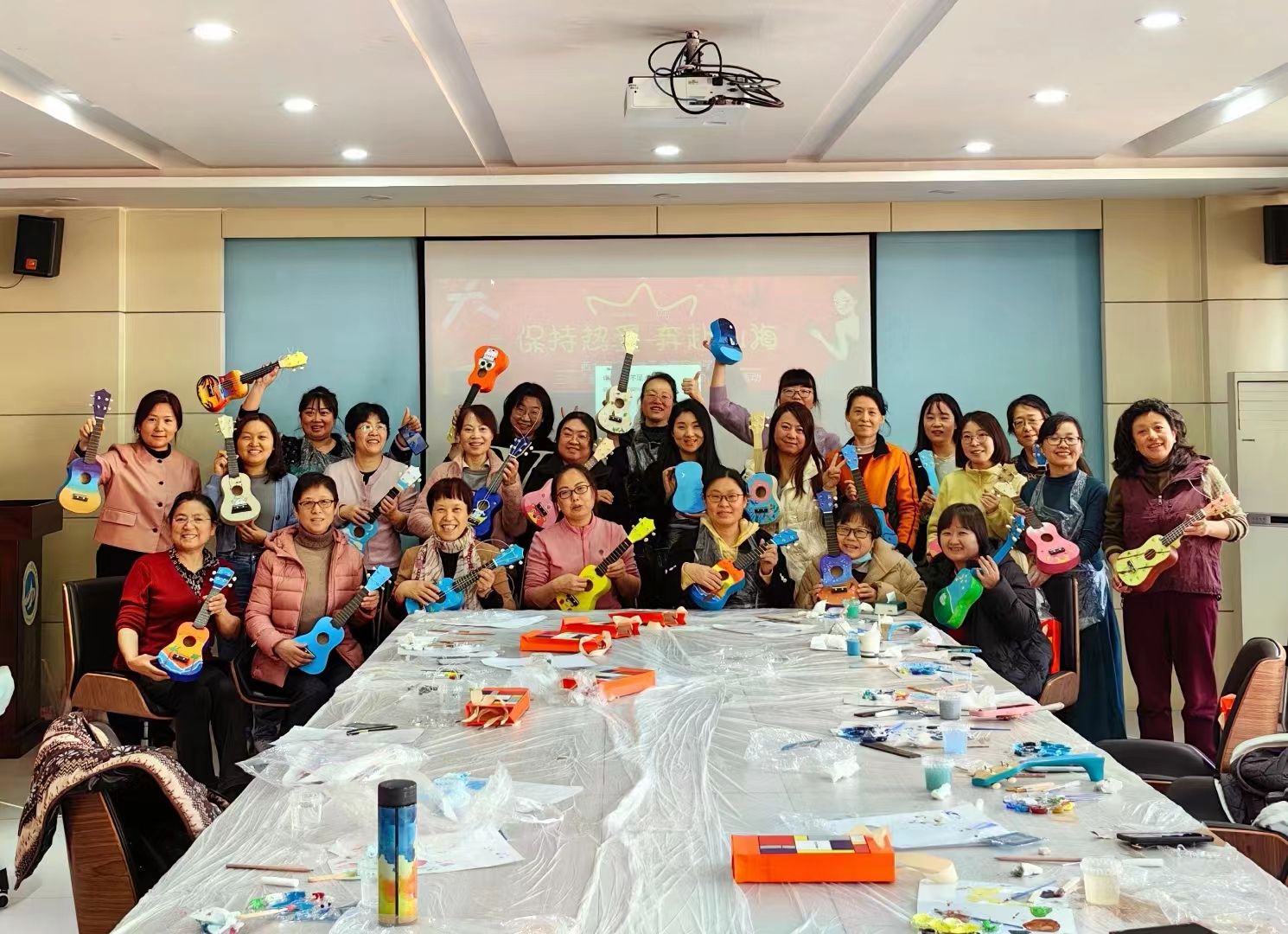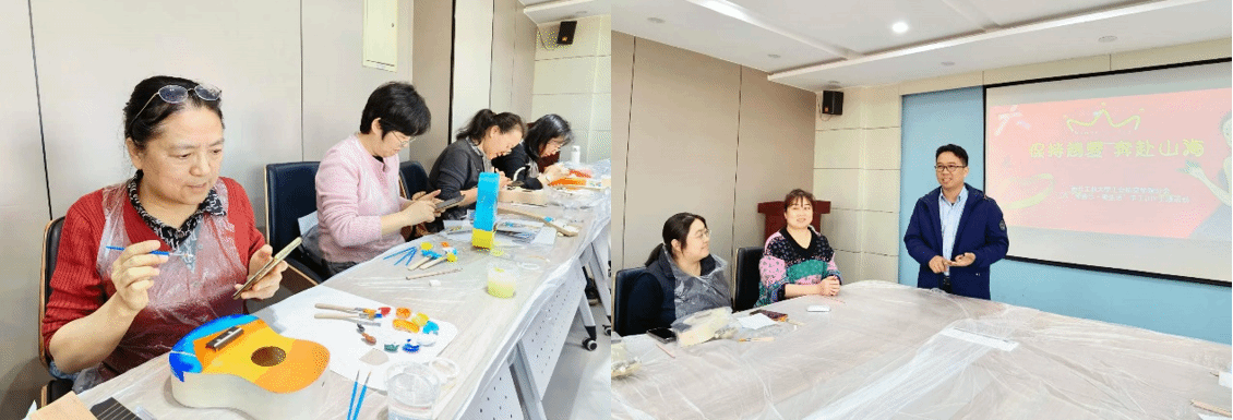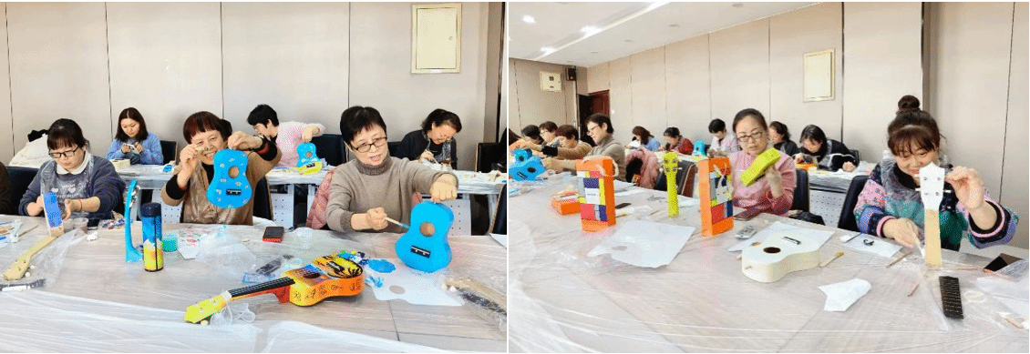 学院围绕“爱生活·爱音乐”主题,分别为女教职工准备了丝巾和尤克里里DIY。本次活动特别邀请了尤克里里彩绘的专业老师,活动流程包括:尤克里里初步介绍、分享手绘素材、绘画工具介绍、尤克里里手绘和组装。在老师们的介绍和分享后,女神们便开始了各自的创作。