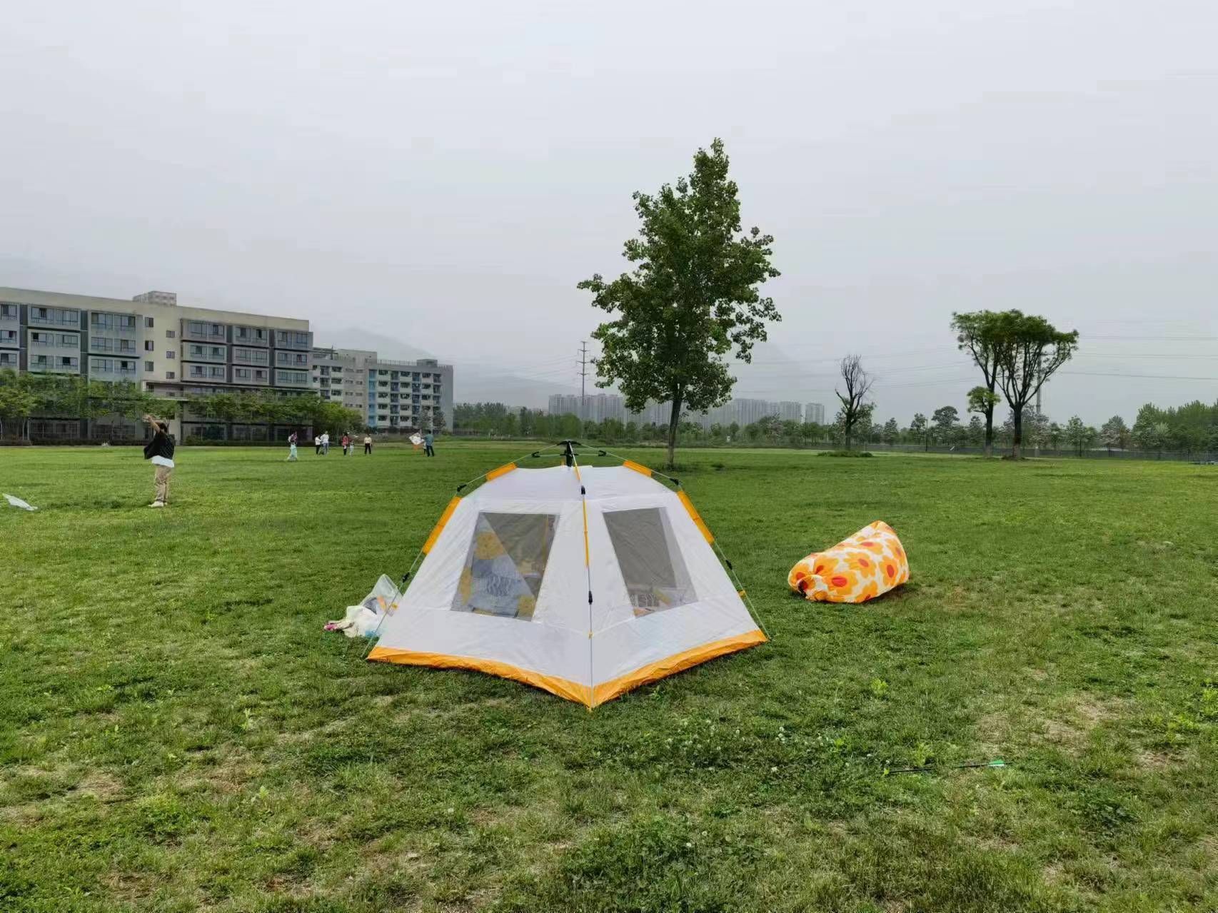 游乐活动结束后,有的老师在大草坪上搭起了帐篷,孩子们在柔软的草坪上尽情地撒野、嬉戏。