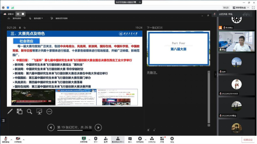 首先,李斌老师对本次大赛进行了全面介绍,特别强调了大赛是被国内外研究生培养单位和行业广泛认可的全国性、高层次重要赛事,逐步实现与高水平国际赛事接轨。其次,李斌老师讲解了大赛的亮点和特色,特别展示了一些优秀成果,强调大赛将为选手们提供跨学科、跨学校的高水平交流平台,向学术大师及技术总师面对面的学习机会,以及到航空航天领域的就业机遇。