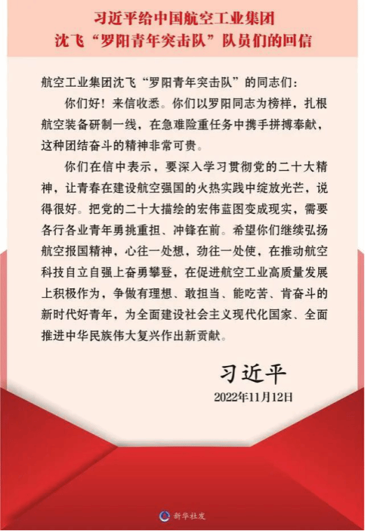 11月12日,习近平总书记给中国航空工业集团沈飞“罗阳青年突击队”的队员们回信,勉励他们学习贯彻好党的二十大精神,为建设航空强国积极贡献力量。beats365官网师生深受鼓舞,纷纷表示将深刻领会习近平总书记的重要指示精神,把学习宣传贯彻党的二十大精神融入实现高水平科技自立自强的实际行动,在时代的挑战中鼓起昂扬斗志,练就过硬本领,为扎实推进航空强国建设贡献智慧和力量。