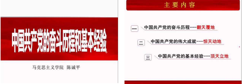 党课的三个部分自然衔接。在第一部分中,老师先向大家展示了中国共产党成立前各阶级的斗争,并通过历史推进逻辑指出,中国共产党时开天辟地的大事变;在此基础上展示了中国共产党的奋斗历程与各阶段的历史贡献。在第二部分中,陈老师向大家展示了中国共产党的伟大成就是开辟了中国特色社会主义道路、形成了中国特色社会主义理论体系、确立了中国特色社会主义制度,发展了中国特色社会主义文化等。在第三部分中,总结出中国共产党的基本经验是:坚持马克思主义基本原理与中国具体实际相结合,走自己的路;必须始终依靠人民群众,诚心诚意为人民谋利益,从人民群众中汲取前进的不竭动力;坚持党要管党,从严治党,保持党的战略地位。
