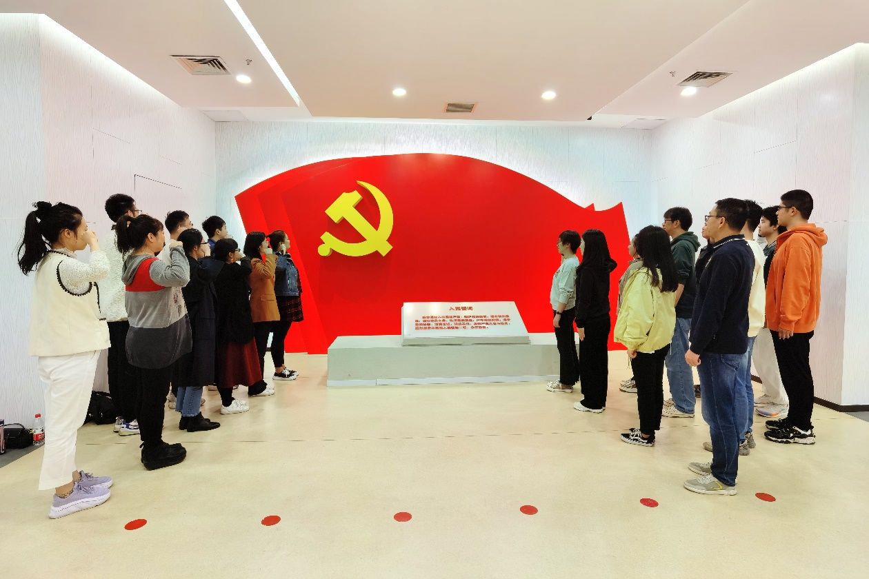 临近结束,大家驻足入党誓词展厅,面对鲜红的党旗,师生党员一起高举右手庄严宣誓,重温入党誓词。