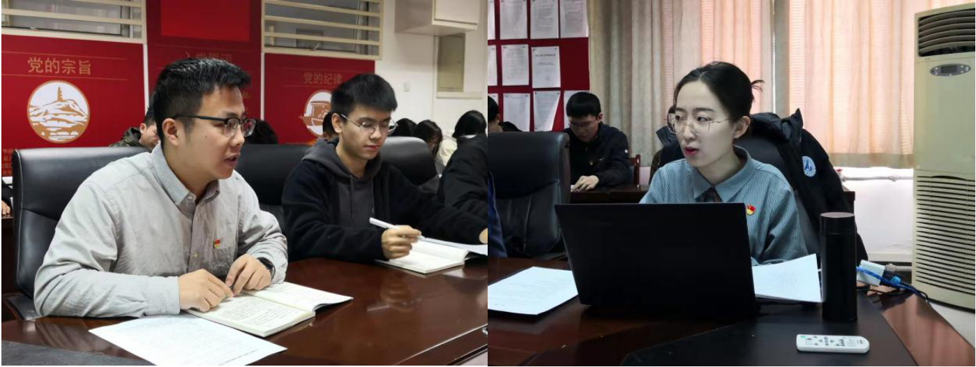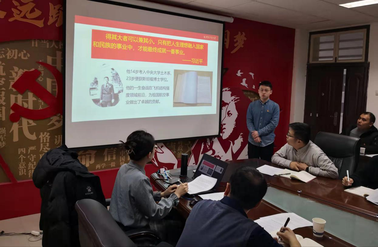 而后,党支部开展了“人人讲党史”活动。朱北晗同学讲述了“两弹一星元勋”屠守锷潜心为国铸长剑的故事;段青放同学讲述了“中国航空教育家和结构力学专家”黄玉珊热爱祖国、忠诚教育、献身航空、勇于探索、追求真理的故事。索涛对学生讲述作了点评。