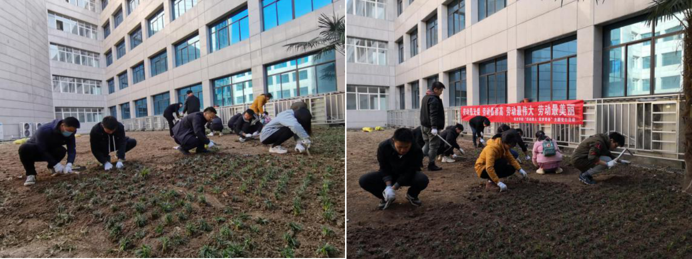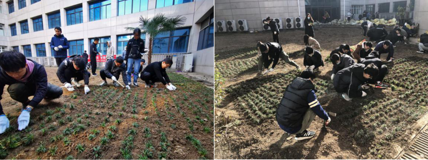 劳动现场,学生党员两三人一组,挥铲刨沟、扶苗栽植,相互间有序衔接、默契配合,人人干劲十足,热情高涨,用心用情栽好每一棵草,热火朝天的劳动场景在校园里形成了一道独特亮丽的风景线。