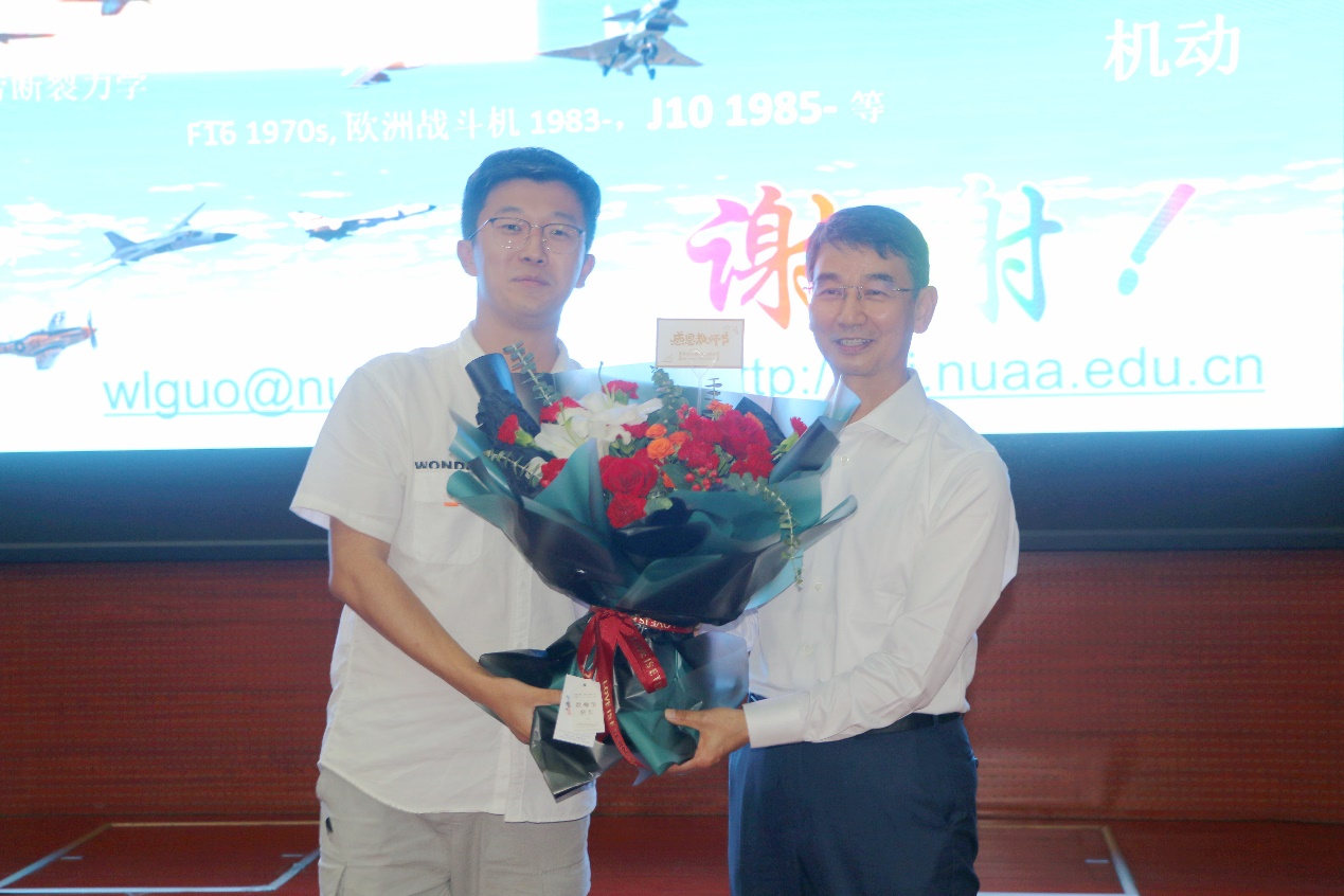 报告会在一阵热烈的掌声中结束。会后,学生代表白怡暄为郭院士送上鲜花并送上教师节祝福,他说:“郭院士的讲座让我受益匪浅,作为新一代的航空学子,我们必将秉承严谨科学的学习态度,不忘初心,力争为祖国的航空事业贡献属于自己的一份力量,要向郭院士学习。”