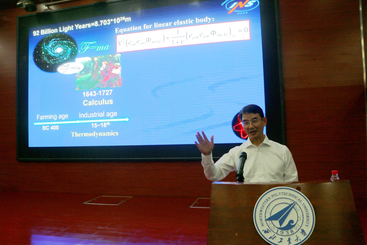 郭万林院士以力学、材料学科和飞机设计理念的发展历程开篇,生动讲述了解决航空航天飞行器研制中力学问题的科学故事,阐述了纳尺度物理力学的理论体系和颠覆性技术以及在现代飞机设计的智能化发展,介绍了水伏学的研究成果及其在能源、生命科学、资源环境中的应用。郭院士的报告从大学阶段的知识学习、研究生阶段的知识创新到实际工作中的知识应用,从“顶天”的理论创新到“立地”的工程应用,从科学研究到社会发展,从科学精神到家国情怀,深入浅出,旁征博引,不仅仅是一场专业学术的讲座,更是一场启发科学思维的报告。