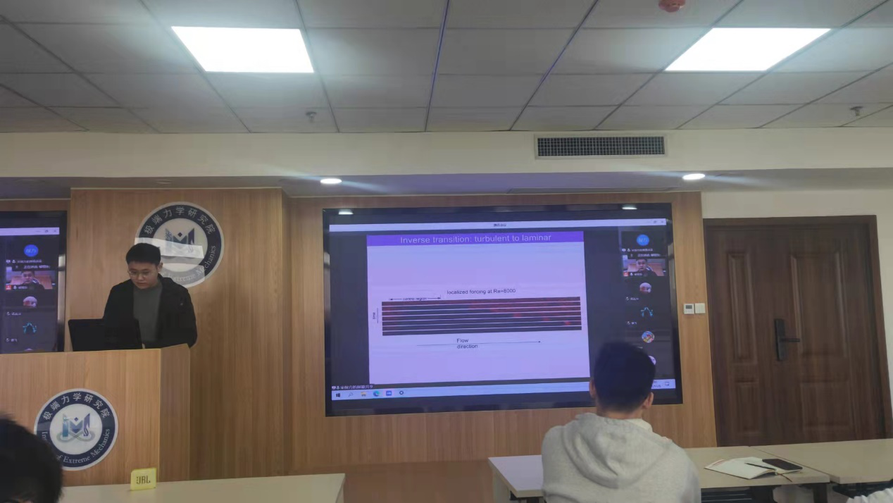 11月5日,应郗恒东教授的邀请,天津大学应用数学中心宋保方副教授为极端力学研究院和流体力学系师生作题为“管流转捩与湍流控制”的线上学术报告。报告开始前,郗恒东教授首先介绍了宋保方副教授的学术经历与研究方向,并强调宋教授其实也是在座流体力学系学生们的学长,告诫同学们努力做科研向学长学习。