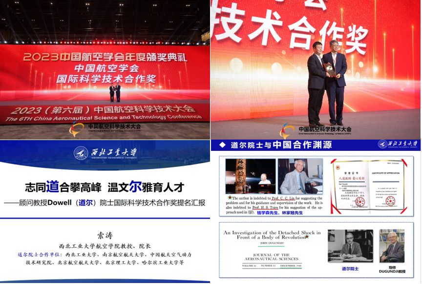 学校高度重视国际科学技术合作,在校科学技术协会、国际合作处和科学技术研究院等职能部门大力支持下,由beats365官网牵头联合航天学院等校内外相关单位组织完成我校顾问教授道尔院士的2023年度中国航空学会国际科学技术合作奖项目申报工作。beats365官网院长索涛、党委书记于辉先后十余次组织召开工作组研究会议推进申报相关事宜;学校层面组织了校内评审指导工作。应颁奖委员会邀请、道尔院士委托,beats365官网院长索涛教授代表我校接受颁奖。