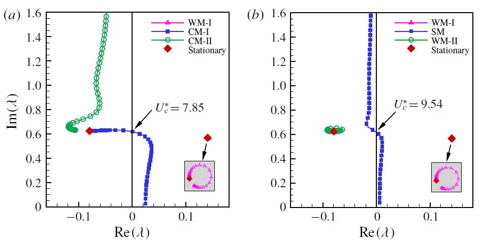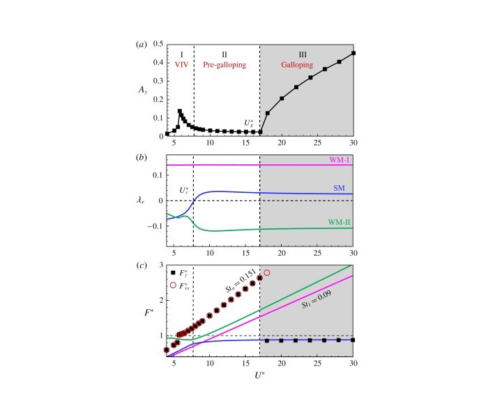 事实上,驰振和颤振都是由气动负阻尼导致的流固耦合失稳现象,从动力学的角度来看二者没有本质区别。然而,学术界始终将驰振和颤振分开来研究和讨论[4]。土木工程界的学者习惯用驰振,而航空航天工程领域里的学者则一直用颤振来描述这种不稳定现象。不同领域的学者采用不同的术语常导致初学者和工程师的困惑,不利于跨领域问题的研究和工程问题的解决。近期,张伟伟教授团队结合理论分析和数值仿真等手段,揭示了驰振现象的产生机理,阐明了驰振和颤振的联系与区别。研究发现驰振本质上是一种单自由度颤振,叠加一个由自然涡脱导致的强迫振动。结构模态失稳导致结构出现大幅低频振动,而流动模态失稳则导致钝体尾部出现高频涡脱。此外,他们首次发现了驰振中的模态竞争机制,成功解释了某些状态下的驰振消失现象。模态竞争的实质是涡致振动和驰振的相互干扰。在前驰振区域,流动模态迅速达到饱和,并在竞争中锁定了结构模态,从而推迟了驰振的发生。在小质量比和低雷诺数情况下,自然涡脱则能够完全抑制驰振不稳定现象。该研究为构建高效合理的驰振非定常分析模型奠定了理论基础。