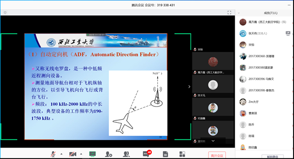 院长助理于兆良老师在听了谭明虎老师的《计算方法》、和麟老师的《飞机电子电气系统与维修(英)》两门课后说:“通过线上课堂,让我们明白,虽然此次疫情给教学工作带来的不便,但在学校总体部署下,在教务和技术部门的倾情护航指导下,在全体师生的共同努力下,一切困难都是难不倒我们西工大人的。 此次线上课堂,有助于引导学生主动学习,同时也对老师提出了更高的要求,要求教师通过精心设计线上小班讨论、作业反馈、网络学堂讨论等环节更好地与学生交流反馈。同时,我们也相信,只要我们全体师生心往一处想、劲往一处使,以此次线上课堂为契机,不断更新理念、创新方式方法,深入贯彻“以学生为根”的理念,定能更好地服务好每一位学生,为学校“双一流”建设做出更大的贡献。”