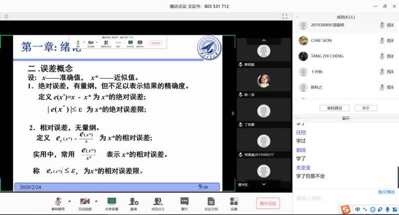 谭明虎老师的《计算方法》由于开始授课前登陆雨课堂失败,直接启动备选方案“腾讯会议”授课。课堂应到学生51人,实际在线63人,学校和学院多位督导老师在线听课。