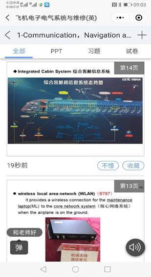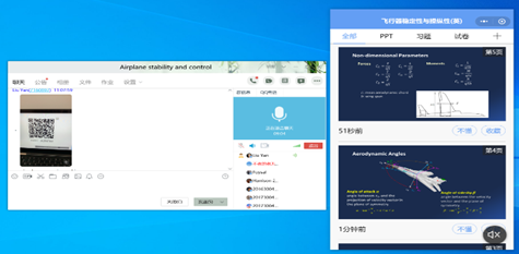 和麟老师的《飞机电子电气系统与维修(英)》采用的是QQ分屏+雨课堂的方式,在刚开始雨课堂不流畅时,QQ分屏保证了课堂授课的正常进行。整个过程中雨课堂能成功发布课堂测验题,收到学生答题、弹幕等反馈,但出现连接不上、卡顿等现象。而QQ一直运行比较流畅,用语音直播、分享屏幕,还能跟学生交流讨论。