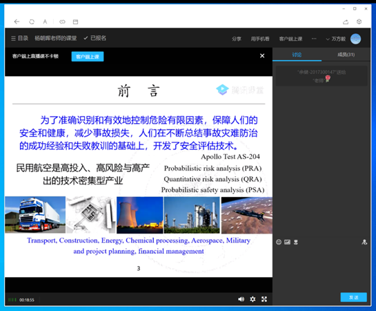 这个时段的另一门课程是杨朝晖老师的《风险分析与灾害防治技术》,采用的腾讯课堂方式,应到学生30人,实际在线31人。腾讯课堂的教学过程流畅,可以通过聊天互动,学生还可以给老师送花,教学感受良好。