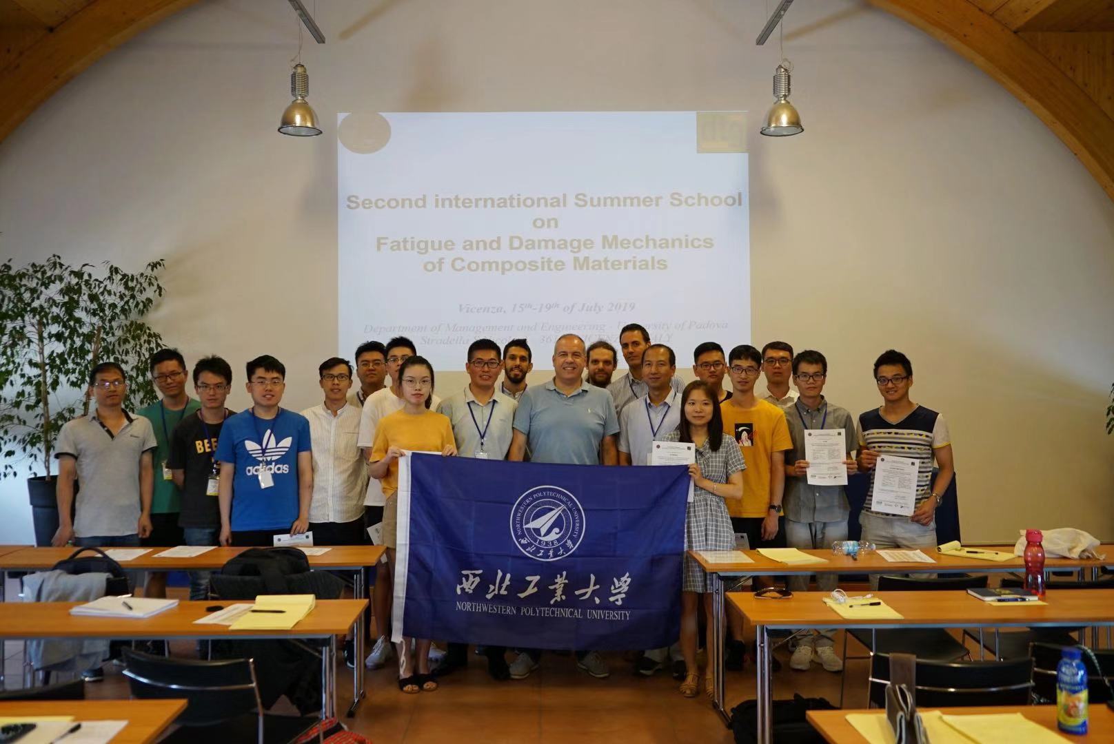 7月13-25日,beats365官网闫雷雷副教授带领13名博士及硕士研究生于赴意大利帕多瓦大学参加“第二届国际复合材料疲劳与损伤力学暑期学校”和复合材料实验测试技术培训。该暑期学校由意大利帕多瓦大学的Marino Quaresimin教授牵头组织,邀请国际上复合材料领域知名教授和专家进行全英文授课,每两年举办一次。本次大会吸引了包括意大利、中国、法国、西班牙、土耳其、美国、韩国、日本等20多个国家的高校教师、专业技术人员、博士及硕士研究生近百人参加。其中我校14名师生参加,为规模最大的一支队伍。