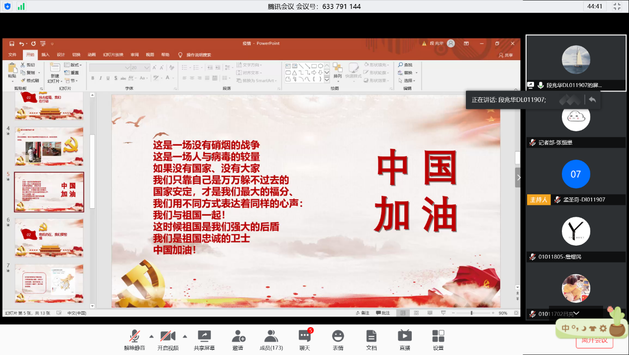 “会议中参与分享的每一个人,以及未能分享、但却参加到抗疫的每一个人,都值得我们称赞一声英雄,都值得我们去学习。如今,国际的疫情形势越发严峻,更需要我们每一人都献出自己的一份力,为抗击疫情做出贡献。” DL011909班的张佳畅同学这样感叹。