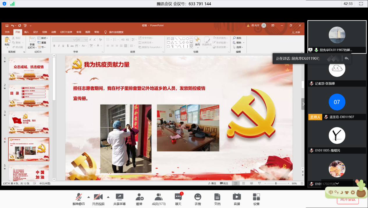 随后,DL011905班杨月、01011802班余时泷、01011801班于洲洋、DL011907班段兆华同学依次发言,声情并茂地向大家讲述了自己在抗疫期间做出的贡献与思考感悟。在严峻的疫情形势面前,他们争当先锋,尽己之力为抗疫贡献力量。