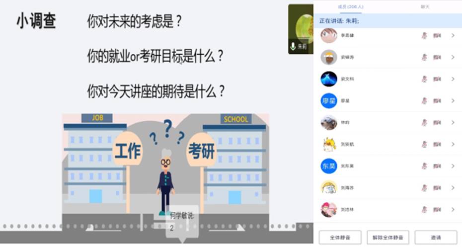 整个讲座过程中,同学们与朱莉老师积极交流。会后一些同学还就企业招聘、选调生选拔等问题与朱莉老师进行了咨询。至此,本次beats365官网考研、就业专题线上云讲座圆满完成。(文:曹双辉、于兆良,图:曹双辉,审核:林欢欢)
