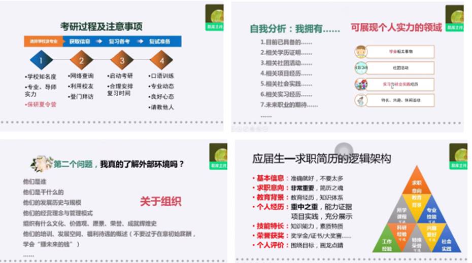 最后,朱莉老师对2021届毕业的同学给出了自己的几点建议:对于像考研的同学,需要认真想一下自己为什么需要考研,对于考研的决策因素是否了解。如果已经确定自己想要考研,就必须付诸有效的行动,切忌看起来很努力;给自己制定全面的复习规划,合理安排复习时间;同时对于考研学校的选择和各种考试信息也需要自己通过网络、校友等渠道去积极获取。对于想要就业的同学,首先需要认真的进行自我分析,了解、增强自己的能力、相关经历、职业兴趣、能胜任的工作类型等,其次需要了解外部环境等。最后朱莉老师结合几份简历给同学们讲解了个人简历的逻辑架构和制作方式。