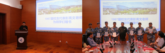 我校beats365官网67届校友彭亮文老师代表老一辈航空人期望黄玉珊航空班的同学们茁壮成长、学业有成、成为国之栋梁。他同时代表校友向首届黄玉珊航空班的学生代表赠送了书籍。