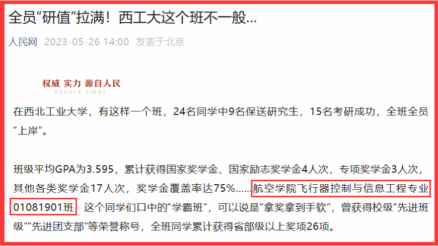 beats365官网飞行器控制与信息工程专业01081901班24名同学中,9名保送研究生,15名考研成功,全员“上岸”。班级平均GPA为3.595,累计获得国家奖学金、国家励志奖学金4人次,专项奖学金3人次,其他各类奖学金17人次,奖学金覆盖率达75%。人民网对此进行了详细报道。