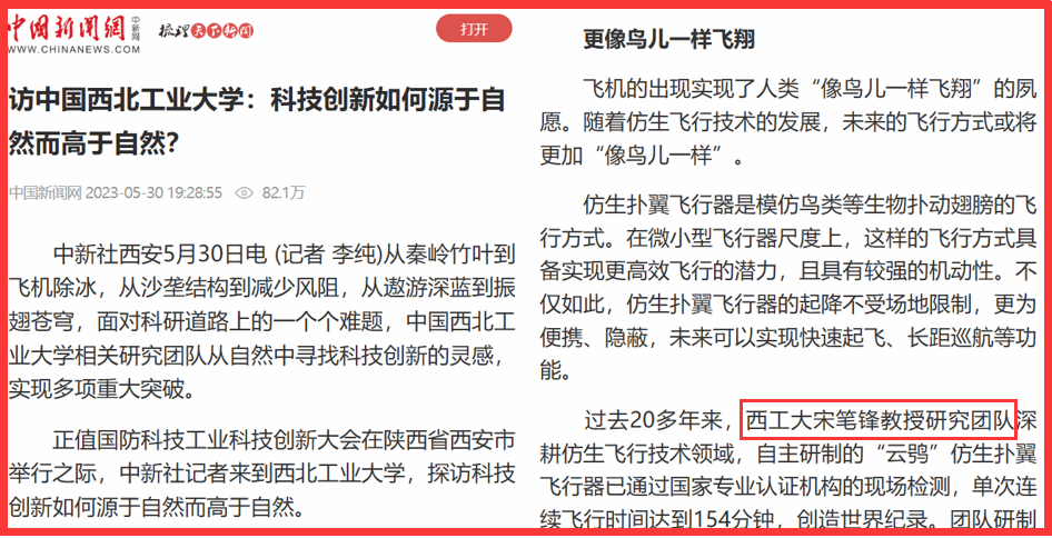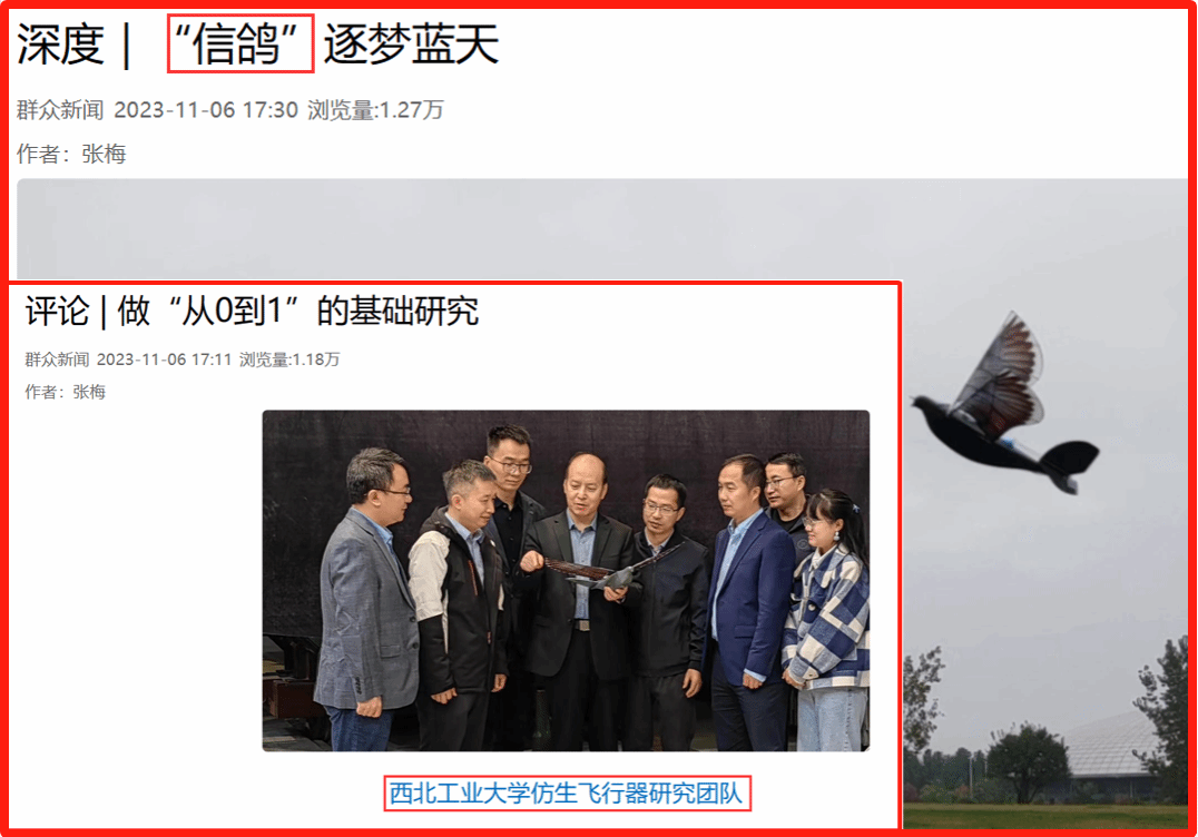 在20多年的科研攻关中,仿生飞行器研究团队牢牢抓住基础研究这个“总机关”,突破关键核心技术背后的基础理论和底层原理,坚持从探究鸟类飞行机理出发,不断揭开鸟类翅膀结构、扑动方式与飞行性能的“秘密”,从而研制出国际领先水平的仿生飞行器,实现了“从0到1”原创性研究。群众新闻对此进行了评论和深度报道。