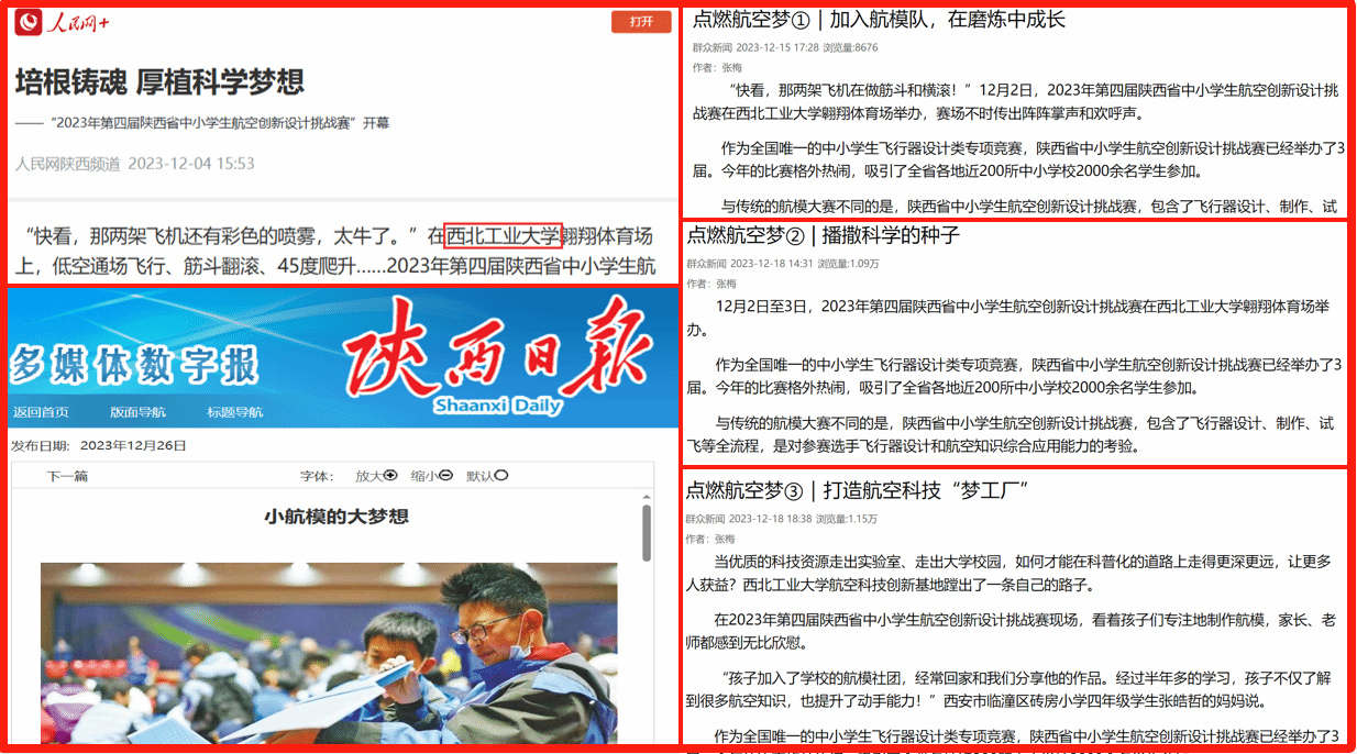 2023年第四届陕西省中小学生航空创新设计挑战赛的表演赛在翱翔体育场举行,近200所中小学校600余组参赛队伍,两千余名参赛学生在表演赛后参加“创意手掷模型竞距”“创意手掷模型留空竞时”“创意遥控模型飞机研制与飞行”“无人机铁人三项”等四项精彩赛事。人民网、陕西日报(整版)、群众新闻公众号对此进行了详细报道。