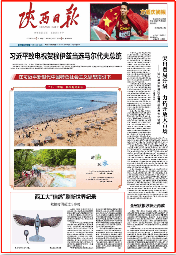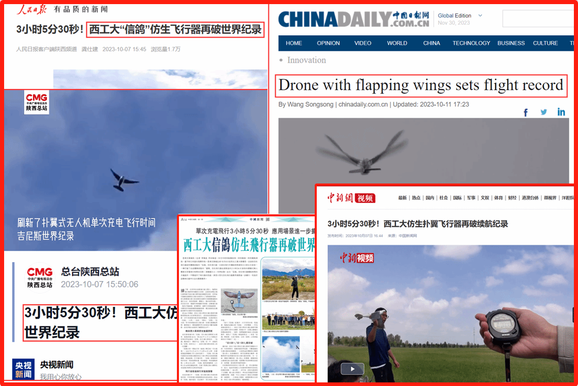 仿生飞行器研究团队研制的“信鸽”仿生飞行器保持了3小时5分30秒的续航时间,打破了由该团队研制的“云鸮”仿生飞行器创造的2小时34分38秒的扑翼式无人机单次充电飞行时间吉尼斯世界纪录。央视新闻、人民日报、陕西日报(头版)、中国新闻网、中国日报(中文版和英文版)、中国教育报、香港文匯报、科学网、凤凰网等对此进行了详细报道。