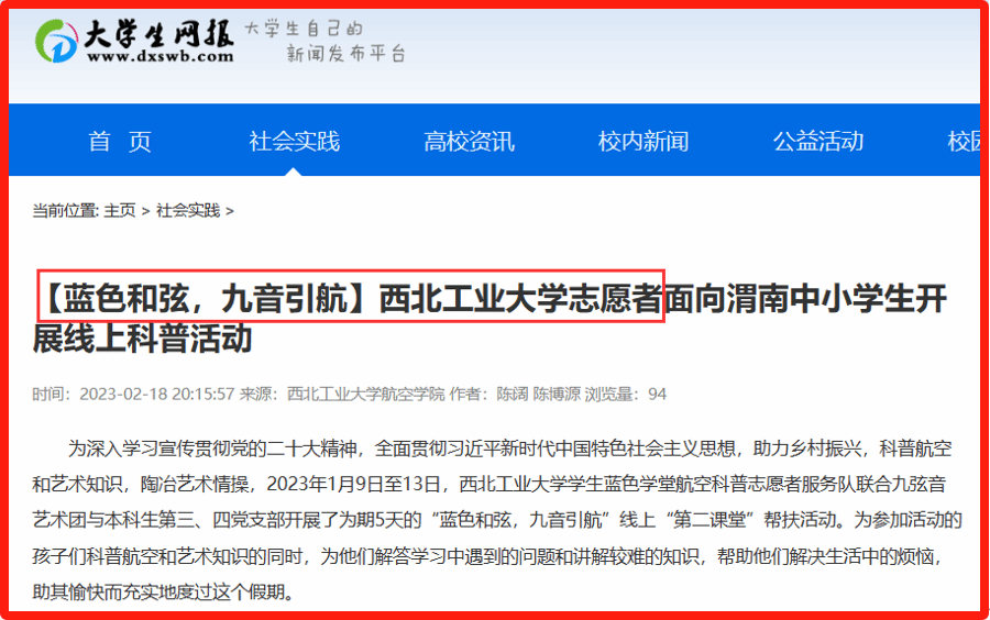 西北工业大学学生蓝色学堂航空科普志愿者服务队联合九弦音艺术团与本科生第三、四党支部,开展了为期5天的“蓝色和弦,九音引航”线上“第二课堂”帮扶活动。大学生网报对此进行了详细报道。