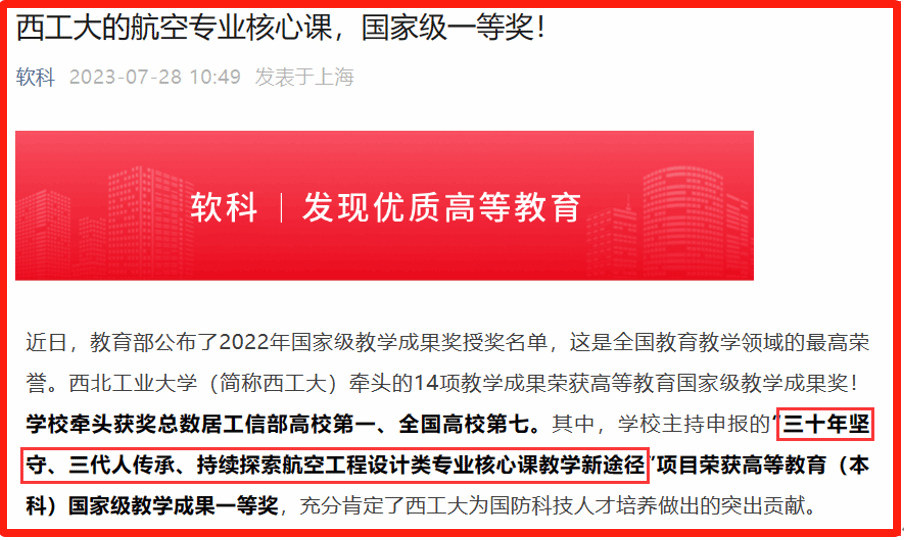 国家级教学成果奖是全国教育教学领域的最高荣誉。学校主持申报的“三十年坚守、三代人传承、持续探索航空工程设计类专业核心课教学新途径”项目荣获高等教育(本科)国家级教学成果一等奖。软科对此进行了详细报道。