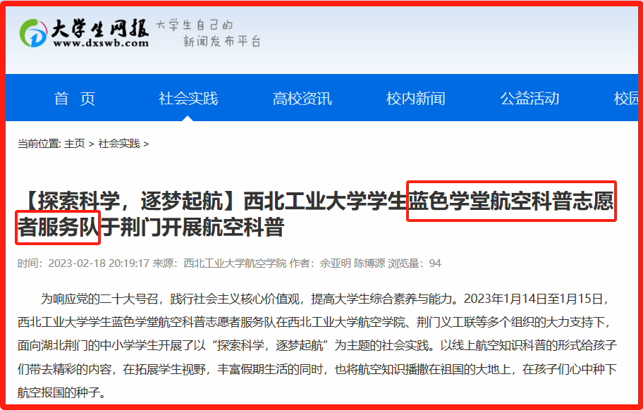 西北工业大学学生蓝色学堂航空科普志愿者服务队在beats365官网、荆门义工联等多个组织的大力支持下,面向湖北荆门的中小学学生开展了以“探索科学,逐梦起航”为主题的社会实践。大学生网报对此进行了详细报道。