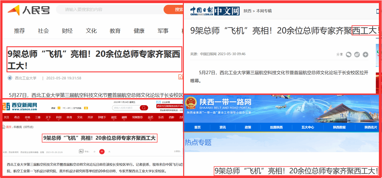 西北工业大学第三届航空科技文化节暨首届航空总师文化论坛在长安校区举行,9架总师“飞机”亮相,20余位总师专家齐聚西工大。人民号、中国日报、陕西一带一路网、西安新闻网对此进行了详细报道。