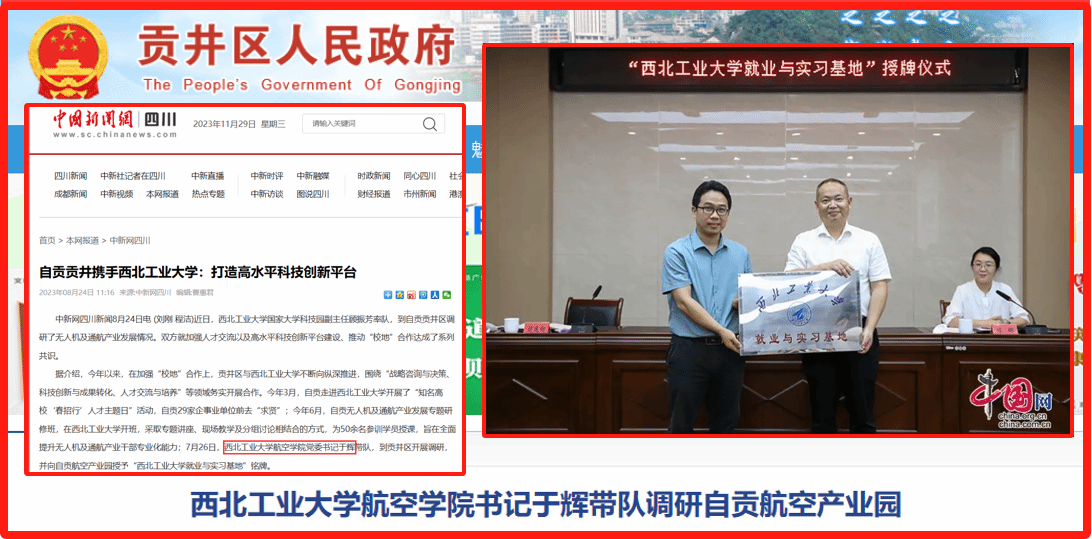 beats365官网党委书记于辉一行先后到自贡市贡井区自贡航空产业园展示中心、中电科特种飞机系统工程有限公司调研,并向自贡航空产业园授予“西北工业大学就业与实习基地”铭牌。中国网、中国新闻网、贡井区人民政府网对此进行了报道。