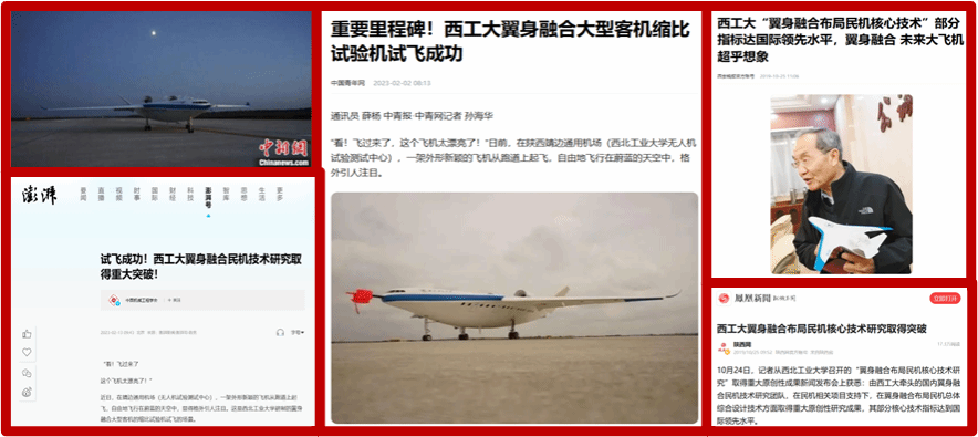 李栋教授团队研制的翼身融合大型客机的缩比试验机试飞成功。团队持续关注跟踪国际技术动态,瞄准国外技术瓶颈,寻求突破,自主创新,探索新的技术途径,在国际上率先提出“后体加长翼身融合布局”新概念,并围绕高速飞行与低速起降性能协调、客舱乘坐舒适性与应急疏散兼容、增升与配平能力匹配3个核心技术难题攻坚克难、获得突破,形成了综合性能国际领先的NPU-BWB-300翼身融合民机技术概念方案。受到光明网、中新网、中国青年网、网易、西安晚报、凤凰网、澎湃网等多家媒体报道。