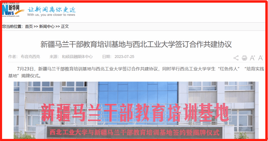 西北工业大学与新疆马兰干部教育培训基地签订合作共建协议,同时举行西北工业大学学生“红色传人”“培育实践基地”揭牌仪式。新华网、和硕零距离对此进行了报道。