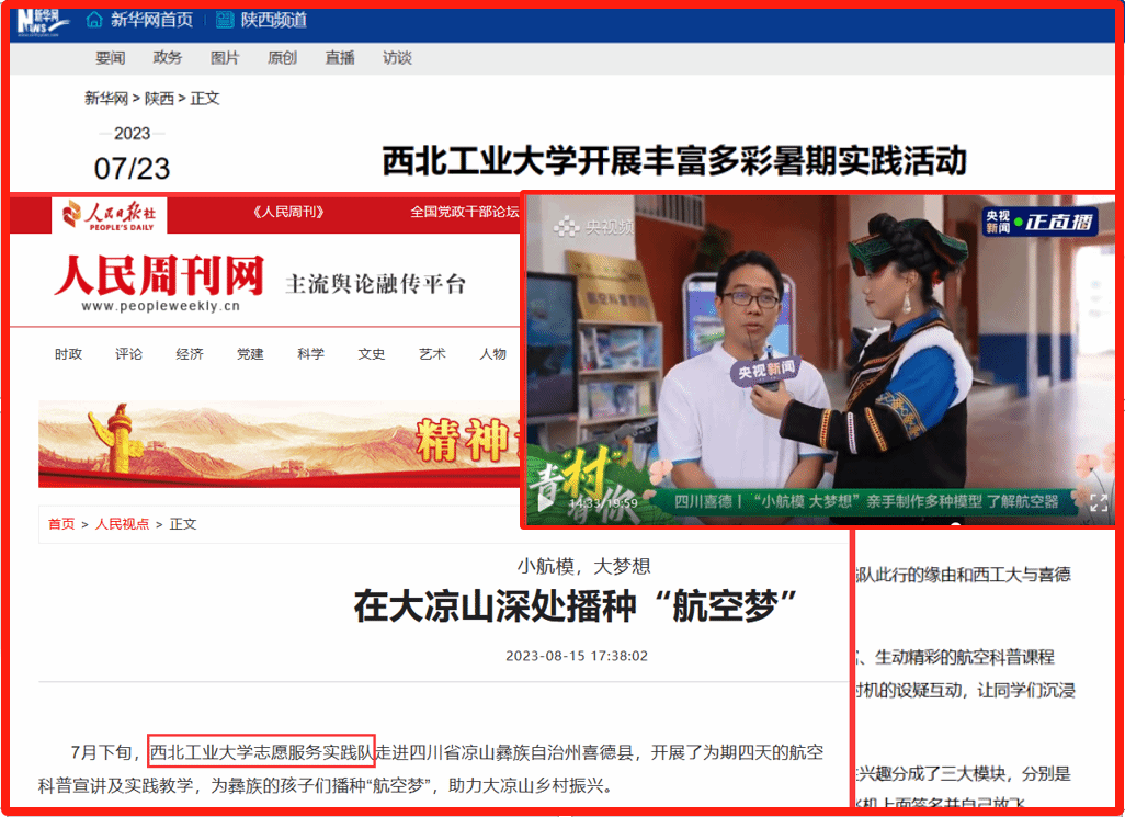 由西北工业大学蓝色学堂航空科普志愿者服务队和航模队的学生组成的暑期社会实践队走进四川省凉山彝族自治州喜德县思源实验学校,开展了丰富多彩的航空科普活动,为彝族的孩子们播种“航空梦”。央视新闻推出的直播特别节目《青“村”有你》对此进行了详细报道,同时新华网、人民周刊网对此也进行了报道。