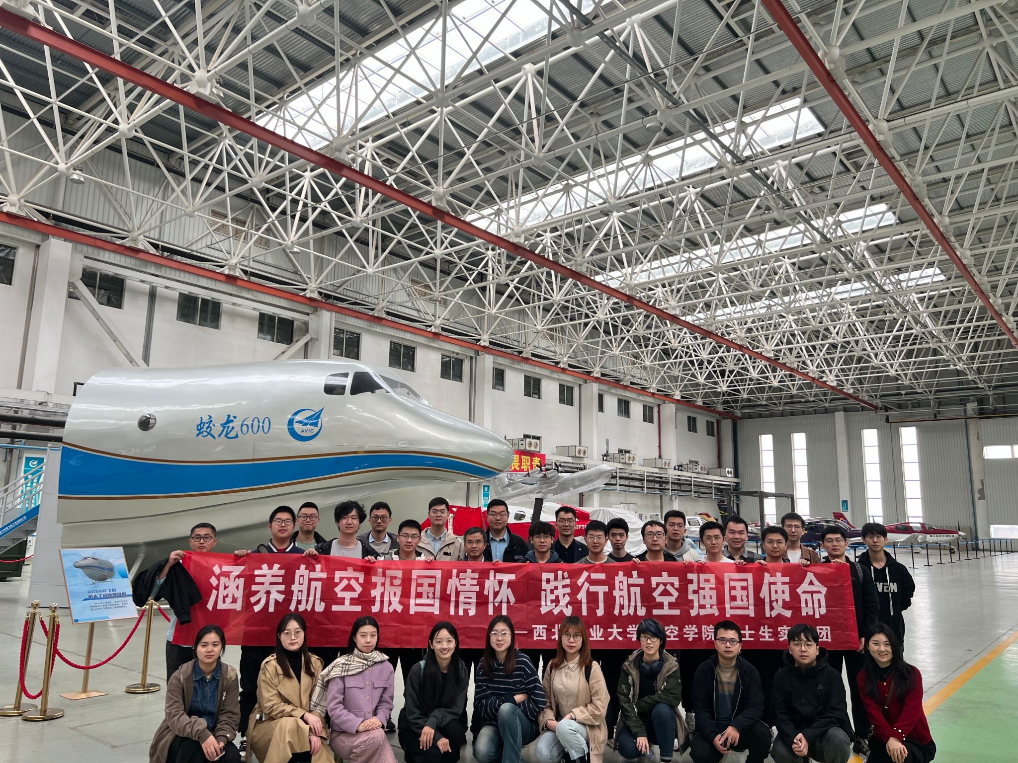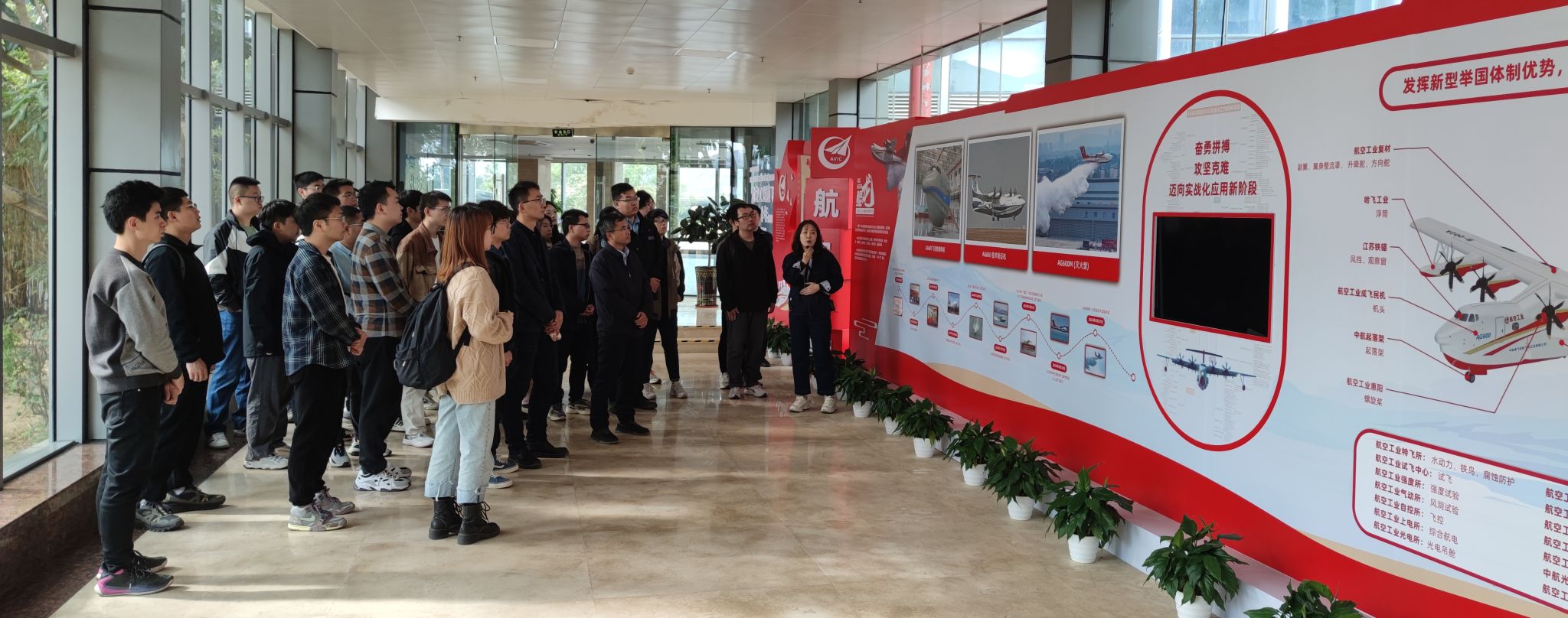 第三站前往通飞华南公司认识实践,强化博士研究生行业认知。通飞华南公司是国家重要的航空产业基地,在研的大型灭火/水上救援水陆两栖飞机“鲲龙”AG600是我国首次自主研制的、为满足国家应急救援体系和自然灾害防治体系建设需要的重大航空装备,与大型运输机运-20、大型客机C919并称为我国大飞机家族的“三剑客”,多次得到党和国家领导人的关注和指示批示。通过参观学习公司的企业文化和技术创新发展,同学们亲身感受到了公司先进的生产技术和管理流程,充分了解了公司的研发和生产情况。此外,同学们还参观了公司的爱国主义教育基地,全面感受了通飞华南公司在航空强国事业上坚守的初心使命,为祖国繁荣而努力奋斗的爱国主义精神。参观不仅为博士生们展现了通飞华南公司的企业文化和爱国主义精神,也激发了大家对于国家航空事业的热情和责任感。同学们深感作为国家航空领域的一份子,不仅要在科研和技术创新上不断进步,更要肩负起推动国家航空事业发展的使命。