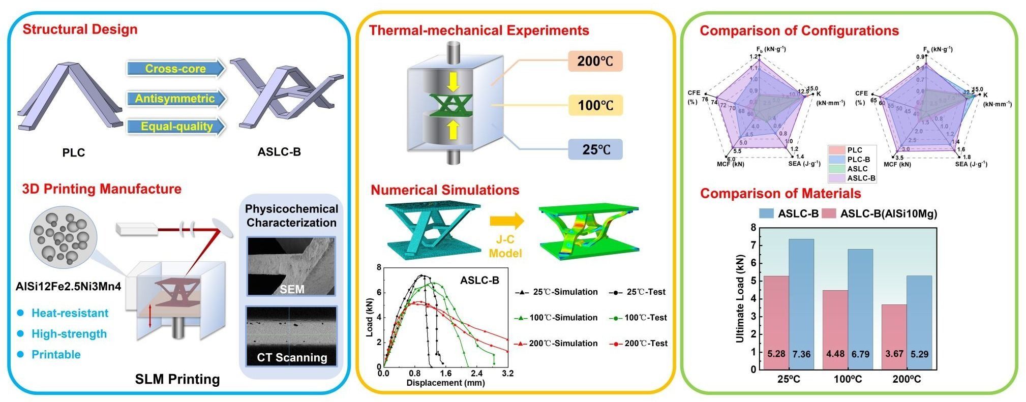 该研究首先基于新型耐温高强AlSi12Fe2.5Ni3Mn4粉末材料和传统金字塔点阵,设计并采用SLM制备了一种通过旋转反射多级化得到的反对称抗屈曲点阵胞元结构(ASLC-B),并通过SEM、三维Micro-CT的多尺度表征手段实现对试件打印质量的验证。进一步的,通过试验测试发现ASLC-B的设计使得结构的承载能力和换热效率相比于传统金字塔点阵均得到了显著提高,同时基于J-C本构建立的高精度数值模型表明,ASLC-B的设计能够优化结构应力分布,有效减小结构屈曲,从而延缓失效的发生。此外,通过对比不同材料的点阵结构承载能力和SEM结果,发现AlSi12Fe2.5Ni3Mn4因耐高温蠕变元素的添加使得和传统铝合金材料相比在保证结构轻量化的同时,结构的高温性能可以有效提升。这项研究通过对耐温高强的新型反对称抗屈曲点阵胞元(ASLC-B)的构型设计、制备表征、性能测试、对比分析的系统性工作,验证了所提出反对称抗屈曲设计方法的优越性以及新型AlSi12Fe2.5Ni3Mn4材料在耐温高强结构中使用的潜在可能性,为点阵结构的热防护设计提供了新的思路。