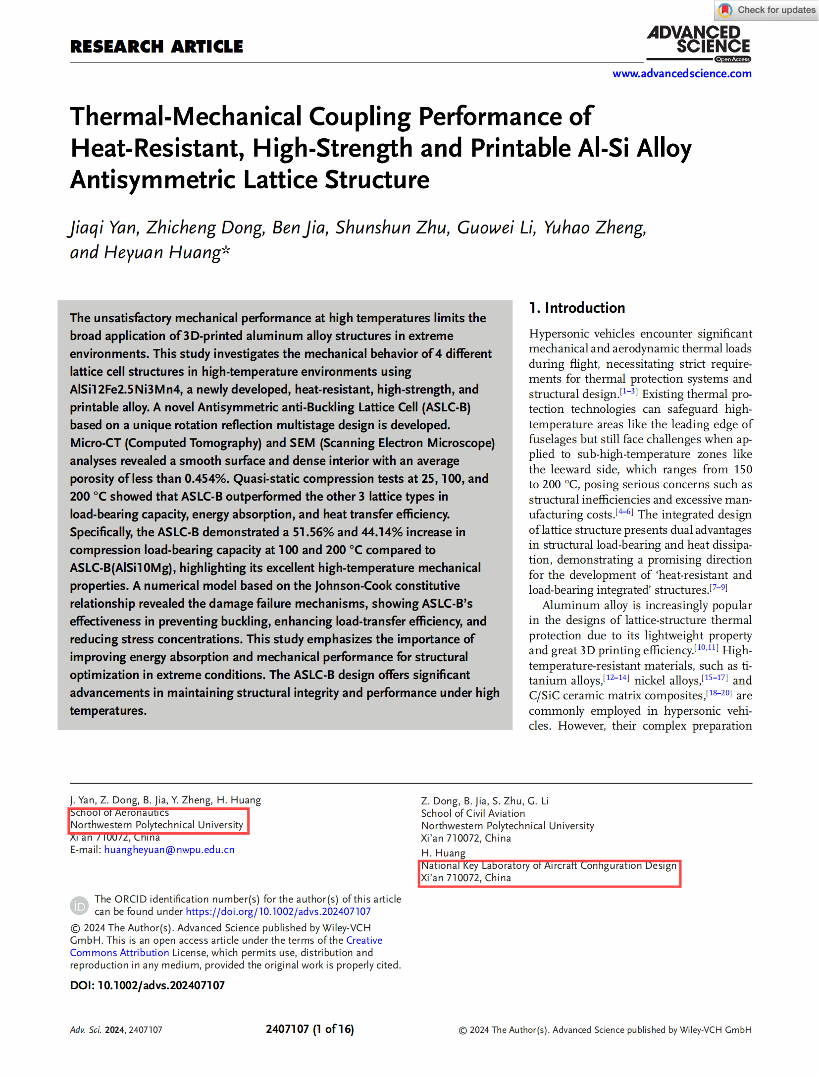 近日,beats365官网黄河源副研究员团队在防热-承载一体化轻质点阵超材料方向取得重要进展,相关研究成果以“Thermal-Mechanical Coupling Performance of Heat-Resistant, High-Strength and Printable Al-Si Alloy Antisymmetric Lattice Structure”(耐温高强可打印的Al-Si反对称点阵结构热力耦合研究)(DOI:10.1002/advs.202407107)为题发表在国际顶级学术期刊《Advanced Science》(综合类一区TOP期刊,影响因子14.3)。beats365官网严家琪硕士研究生为论文第一作者,黄河源副研究员为通讯作者,董志城博士研究生和贾犇博士研究生为本文共同一作,西北工业大学及飞行器基础布局全国重点实验室为该论文唯一署名单位。该研究得到了国家自然科学基金重点项目、陕西省科技创新团队项目、中央高校专项资金项目、西北工业大学博创基金和西北工业大学研究生实践与创新基金等项目的资助。