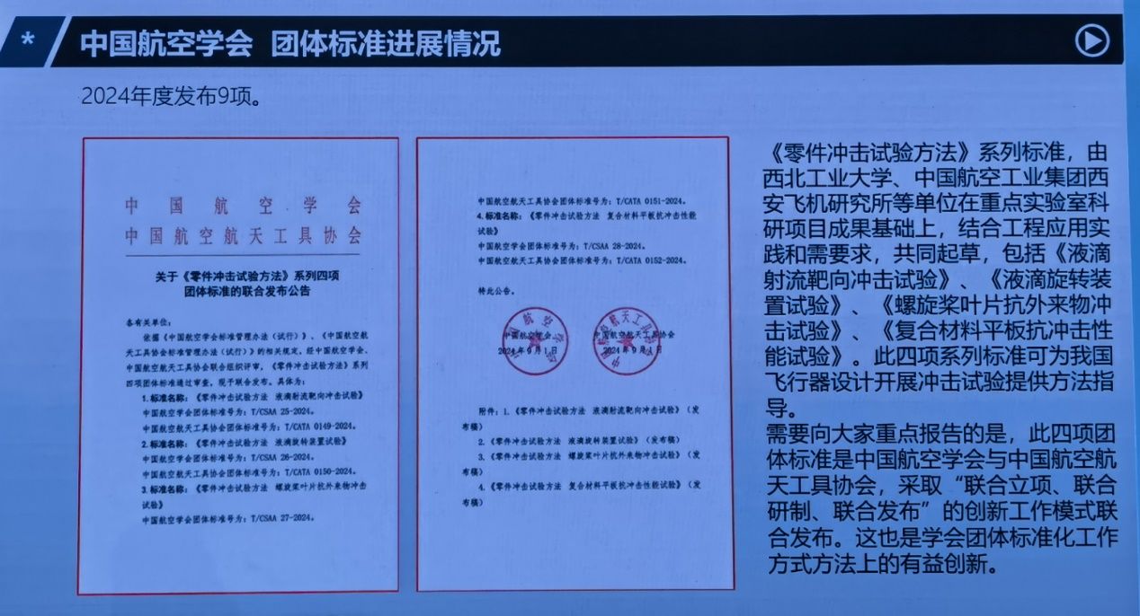 本届大会共发布2024年团体标准9项,其中由西北工业大学牵头四项。会上,由中国航空学会团体标准推进与认证工作委员会副主任,原国防科工局王重秋副司长代表中国航空学会和中国航空航天工具协会同时发布。会上,王重秋高度评价了该四项标准对于推动行业技术发展的重要意义。此次发布的《零件冲击试验方法》系列标准包括:《液滴射流靶向冲击试验》、《液滴旋转装置试验》、《螺旋桨叶片抗外来物冲击试验》及《复合材料平板抗冲击性能试验》,是团队结合行业特点,同时面向航空和航天两个领域,针对相关问题广泛征集,积极推广和推进该系列标准在航空和航天领域的应用,这也是在团体标准工作方法上的有益尝试和方法创新。