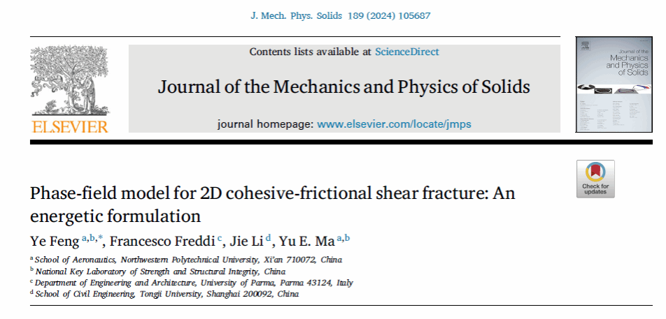 近期,我校青年教师冯晔副教授在固体力学旗舰期刊Journal of the Mechanics and Physics of Solids (JMPS)上发表题为《Phase-field model for 2D cohesive-frictional shear fracture: An energetic formulation》的研究论文。