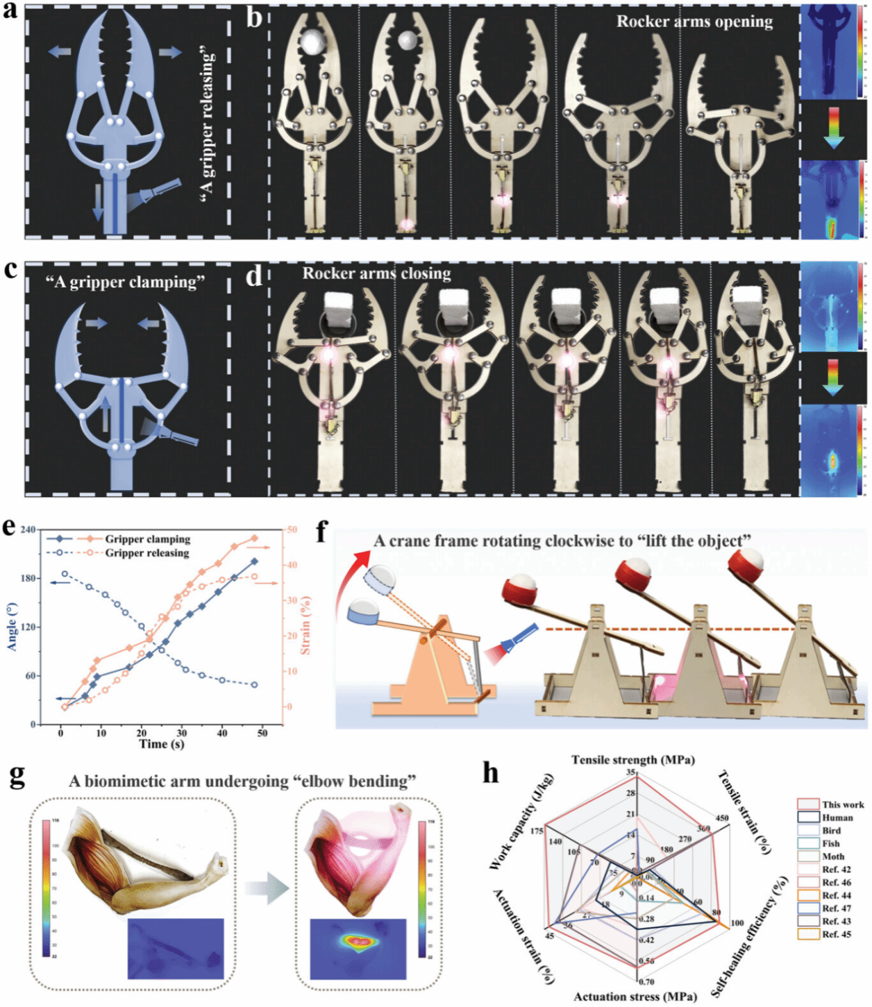 图5功能修复的驱动演示:(a-b)夹持器释放; (c-d)夹持器夹持示意图;(e)夹持器驱动参数; (f)起吊起物体功能演示; (g)仿生手臂肘部弯曲特性;(h)与其他天然或人工材料性能的比较