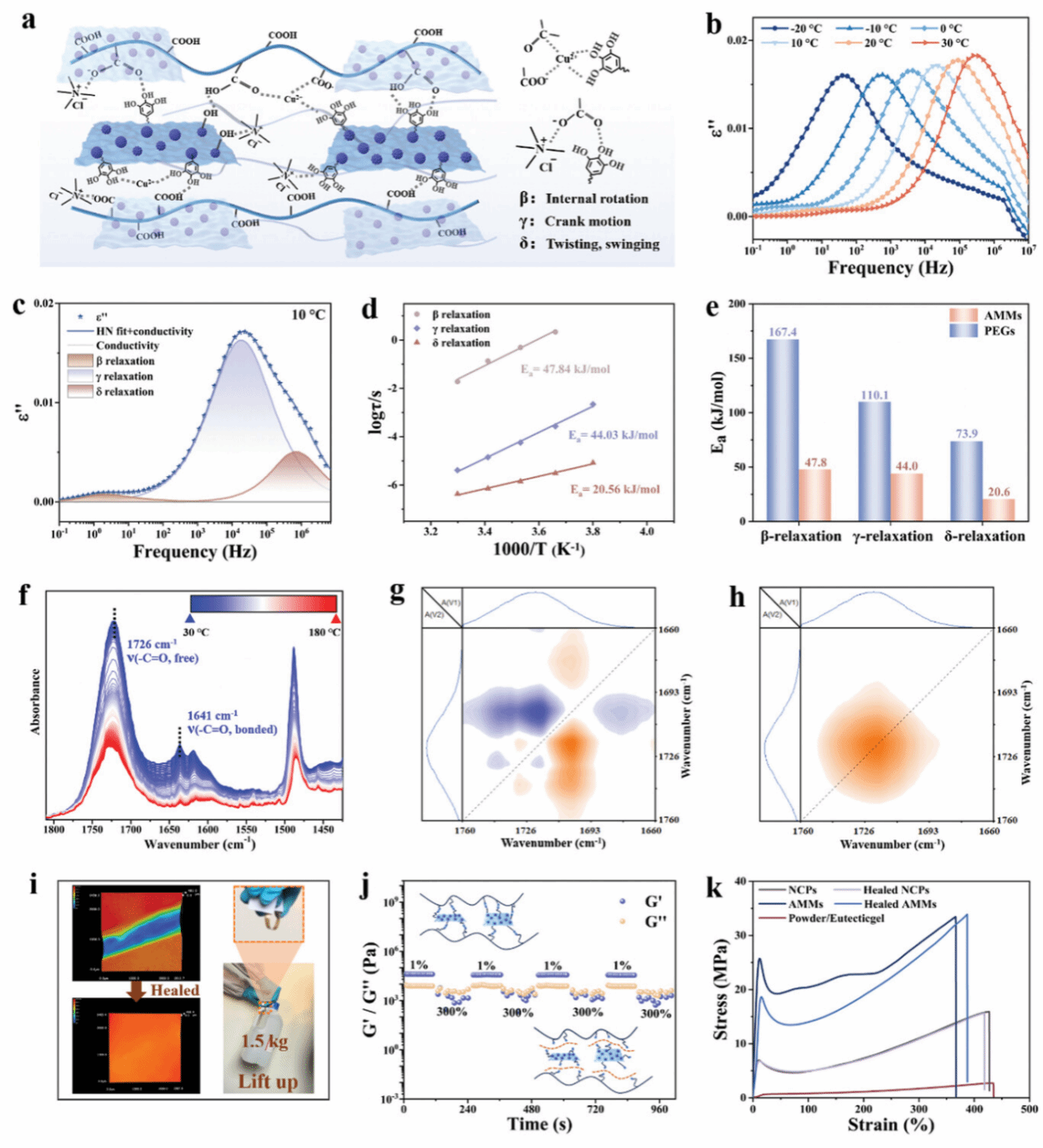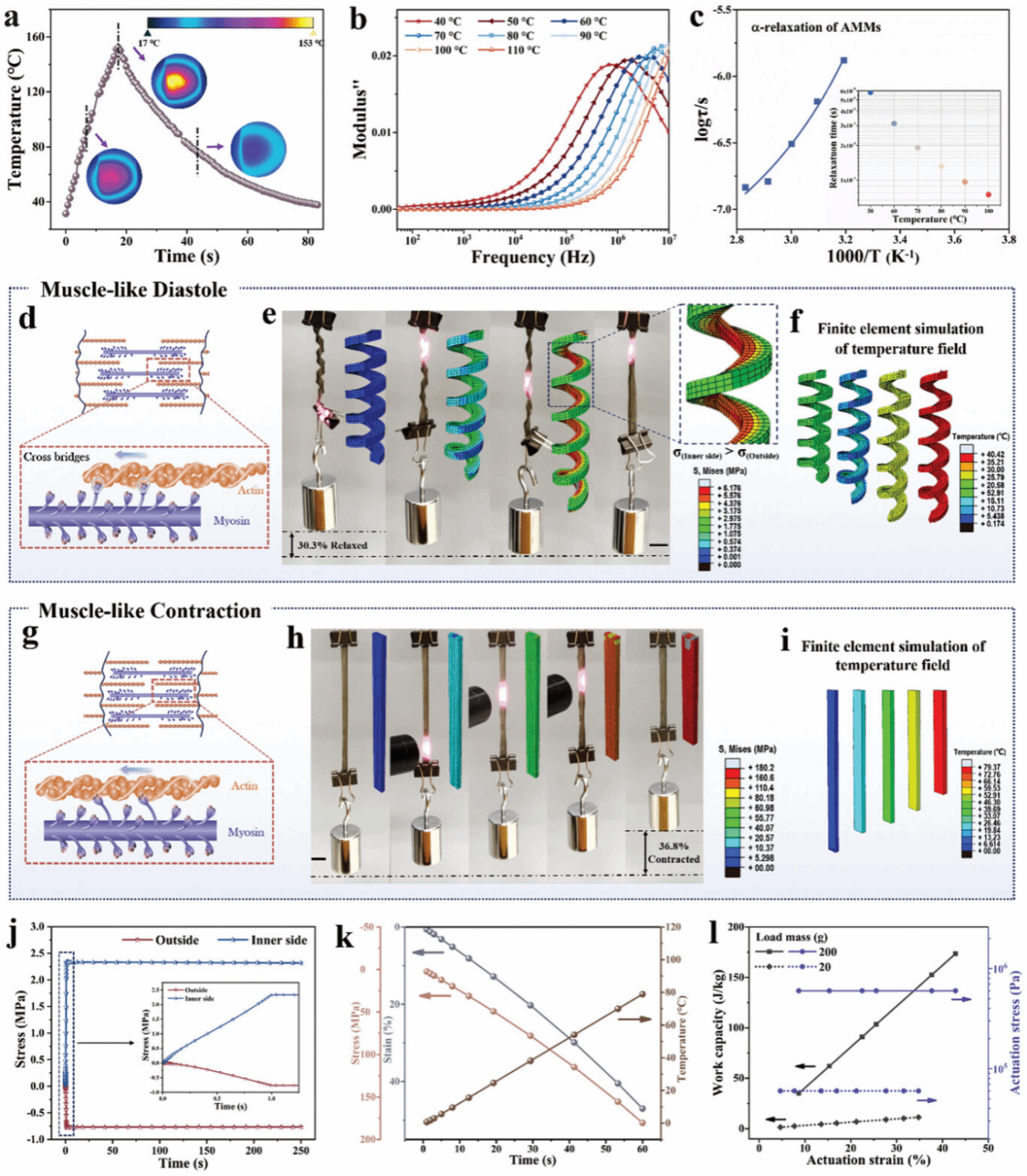 骨骼肌代表了软机器人技术的典范,具有敏捷的运动和令人难以置信的机械坚固性。然而,现有致动器的驱动参数仍然无法与生物组织相媲美,此外结构成分之间缺乏有机整合限制了人造材料自下而上的协同调节,而单调的运动模式和对不可逆损伤的敏感性,使得现有的人造肌肉尚未与它们的生物对应物相匹配,这在复杂的实际变形场景中会产生不可靠的驱动。因此,迫切需要开发一种强致动材料实现人体肌肉样舒张和收缩以达到自愈的效果。为了解决上述问题,西北工业大学苗应刚、四川大学张新星等人开发了一种通过多级松弛实现具有肌肉样舒张和收缩的自愈性强致动材料,它可以模拟肌肉收缩和舒张,具有通过超分子相互作用组装的定向可滑动网络。负载在具有多动态键位点的剥离二硫化钨纳米片上的树枝状多酚改性铜纳米球在肌肉中充当肌球蛋白,而真壳凝胶中的聚合物链模拟肌动蛋白丝。所制备的人工肌肉材料 (AMM) 通过拓扑网络的热膨胀和排列链在高温下的α弛豫伴随着分层结构的滑移来执行舒张或收缩驱动,此外,在可重构界面处动力学活跃的次级 β/γ/δ-弛豫可以克服固定取向聚合物链有限的自愈能力。获得的人造肌肉表现出高输出驱动、坚固的机械性能(抗拉强度为 33.5 MPa)和所需的功能、机械自愈效率 (89.7%),超过了生命系统中的典型自然肌肉。仿生微纳设计策略实现自下而上的协同松弛调制,整合自然肌肉的全面性能,为下一代智能机器人的实质性进步铺平了道路。