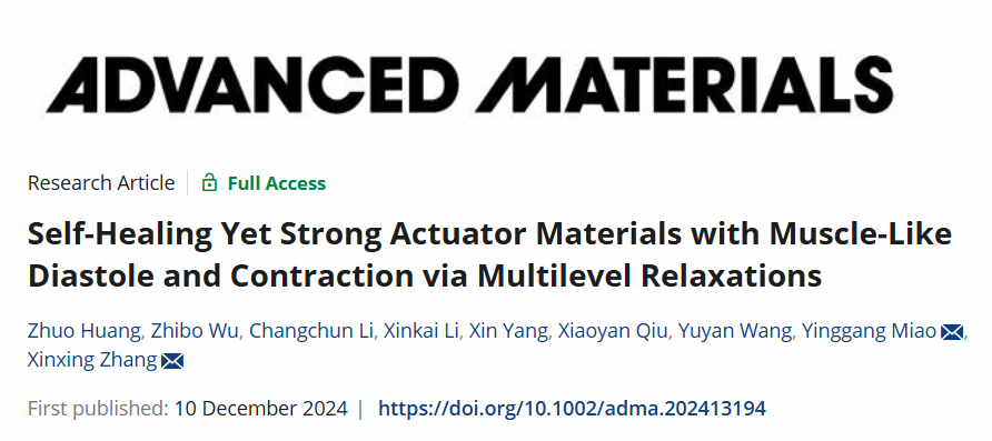 Zhuo Huang, Zhibo Wu, Changchun Li, Xinkai Li, Xin Yang, Xiaoyan Qiu, Yuyan Wang, Yinggang Miao*, Xinxing Zhang*. Self-Healing Yet Strong Actuator Materials with Muscle-Like Diastole and Contraction via Multilevel Relaxations. Advanced Materials, 2024, 2413194.