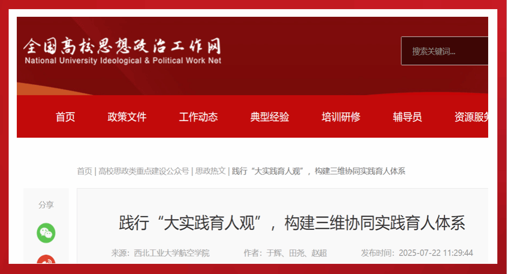 学院立足“为党育人、为国育才”初心使命,深入贯彻落实党的教育方针,充分发挥航空特色优势,强化思想引领,践行“大实践育人观”,传承红色基因、厚植蓝色情怀,探索构建了具有鲜明航空特色的“思政引领―专业导向―社会参与”三维协同育人体系。形成的理论成果“践行‘大实践育人观’,构建三维协同实践育人体系”在“全国高校思想政治工作网”发布。