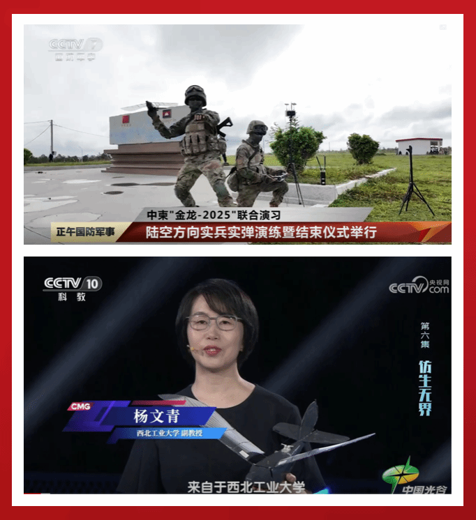 宋笔锋教授团队研制的“信鸽”仿鸟飞行器参加了中柬“金龙-2025”联合演习,这是中国仿鸟飞行器首次飞出国门,参加国际联合军演,并受到央视新闻频道、国防军事频道的报道。央视科教频道系列节目《智绘光谷·CMG世界机器人技能大赛》第六集“仿生无界”中,重点展示了该团队的“信鸽”和“云鸮”两款仿鸟飞行器。