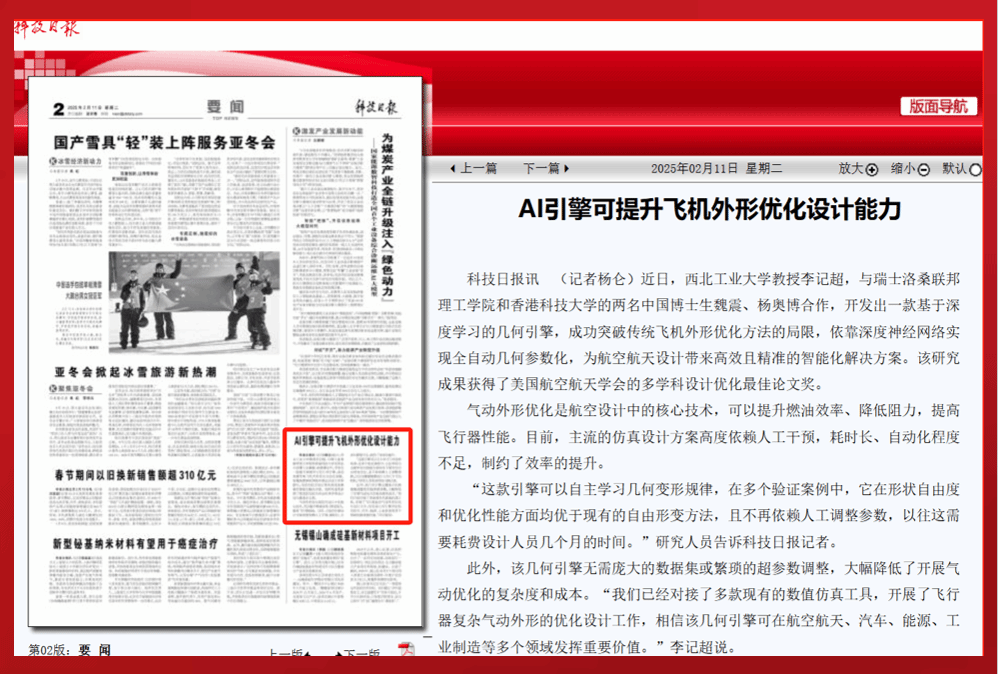 李记超教授与瑞士洛桑联邦理工学院和香港科技大学合作,开发出一款基于深度学习的几何引擎,成功突破传统飞机外形优化方法的局限,依靠深度神经网络实现全自动几何参数化,为航空航天设计带来高效且精准的智能化解决方案。该研究成果获得了美国航空航天学会的多学科设计优化最佳论文奖。人民网、光明网、中国日报、央视网、科技日报等对此进行了报道。