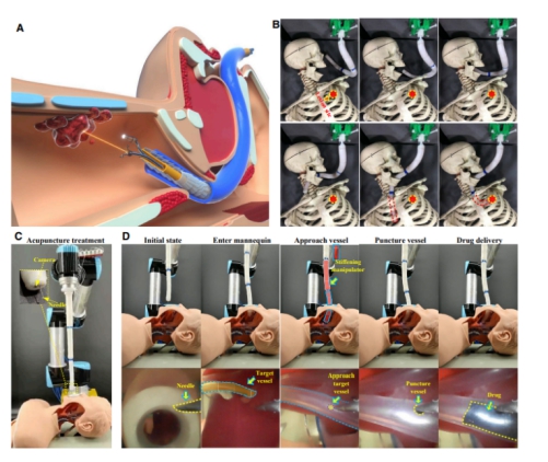 基于软体机械臂的大变形能力,使用遥控手柄对软体机械臂进行操控可完成其在人体骨骼内的狭小空间内的导航。然后,将软体机械臂固定在基板上,并将预先标记病变部位的人体模型放置在附近并保持静止,结合手柄控制并协同软体机械臂的整体进给运动,实现了其在人体自然腔道内的自主穿行,并完成了自主穿刺及送药展示。