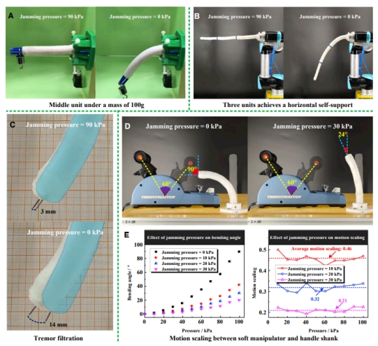 该软体机械臂由驱动单元和刚度调节单元组成,对于驱动单元而言,其弯曲角度与输出力是最为重要的两个性能要素,故通过连续加压测量每个机械手的极限压力,直到驱动室发生故障。由于机械臂单元有三个气室,故采用极限压力的平均值。在单腔和双腔驱动条件下测量,并使用校准的相机来捕获弯曲过程,在图像处理后获得机械手单元的弯曲角度。此外,改软体机械臂可提升超过自身4倍的重物,展示了其强大的力输出能力。通过研究发现,变刚度外套在不同负压条件下可提供不同的抗弯刚度,故可通过不同的刚度条件实现软体机械臂运动幅度的缩放,通过调节变刚度效果可实现弯曲幅度的变化,进一步可以实现对于人手失误所引起的震颤的消除。